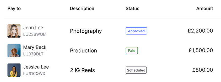 Lumanu fills the gap your platform wasn’t built to solve. Influencer platforms are great at managing relationships, not payments, tax compliance, or finance controls. Lumanu streamlines payments without disrupting your existing marketing workflows.