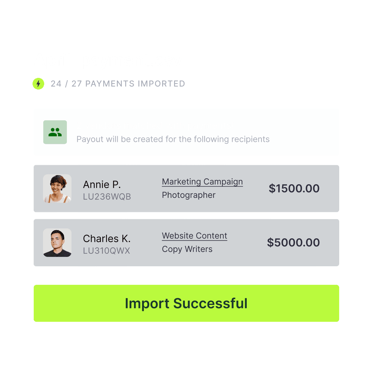 Upload payout data via CSV or integrate with spreadsheets, CRMs, or marketing tools